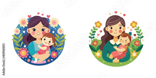 Set of Mother's Day vector illustration of mom and baby isolated on white background