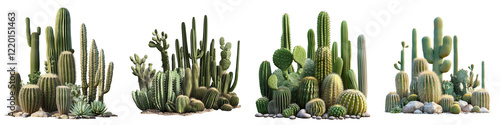set of Multiple cactus plants of various sizes, arranged in a group, a single cactus plant with a blooming pink flower, on a transparent backgrounds