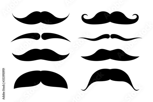 Set of mustaches isolated on white background. Black silhouette of adult man moustaches. Vector illustration