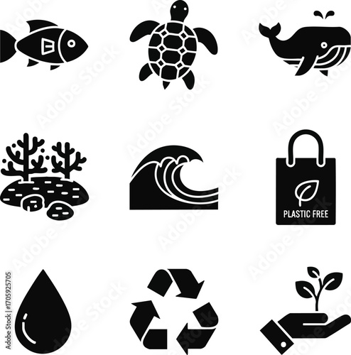 Set of nine monochrome icons depicting ocean life, waves, recycling, and plastic-free concepts