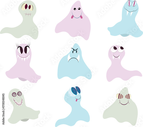 Set of nine stylized cartoon ghosts in light green, pink, and blue. Unique, whimsical faces with various teeth and eyes. Fun and friendly designs, perfect for Halloween projects or stickers.