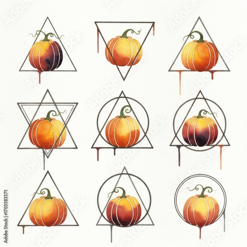 Set of nine watercolor pumpkins with geometric shapes and dripping paint, isolated on white background