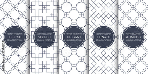 Set of ornamental seamless geometric patterns - symmetric outline textures. White repeatable elegant backgrounds
