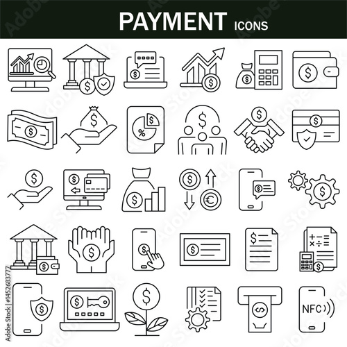 Set of outline icons related to payment methods. Business and finance payment related icons collection. banking, transaction, credit card, exchange, cash and more. Vector illustration . EPS 10.