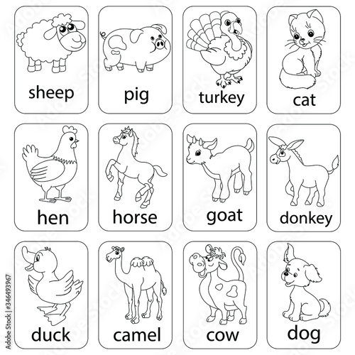 Set of painted black and white animals. Sheep, pig, turkey, cat, chicken, horse, goat, donkey, duck, camel, cow and dog.