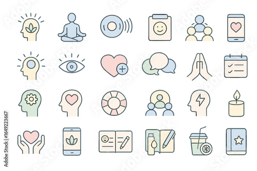 Set of pastel gradient wellness and self-care icons including meditation, mindfulness, communication, gratitude, planning, community, relaxation, and healthy lifestyle symbols