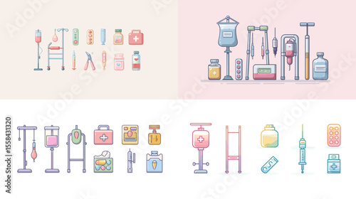 Set of pastel-colored medical tools and equipment icons including IV stands, syringes, pill bottles, and monitors. Ideal for healthcare and hospital-themed designs.