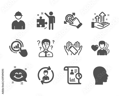 Set of People icons, such as Man love, Smile chat, Touchscreen gesture, Strategy, Engineer, Head, Report, Human resources, Smartphone holding, Support consultant, Graph chart. Man love icon. Vector