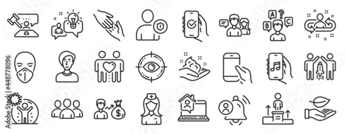 Set of People icons, such as Music app, People talking, Coronavirus protection icons. Approved app, Leaf, Work home signs. Skin care, Businesswoman person, Idea. Hold smartphone, Security. Vector