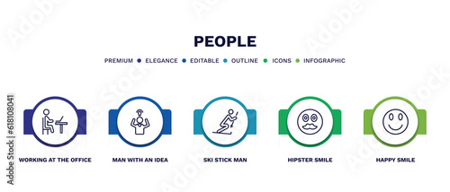 set of people thin line icons. people outline icons with infographic template. linear icons such as working at the office, man with an idea, ski stick man, hipster smile, happy smile vector.