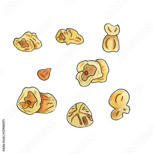 Set of popcorn sweeties isolated on white background. Watercolor hand drawn illustration in cartoon style isolated on white. Quick snack, cinema visiting, movie watching, process of cooking.