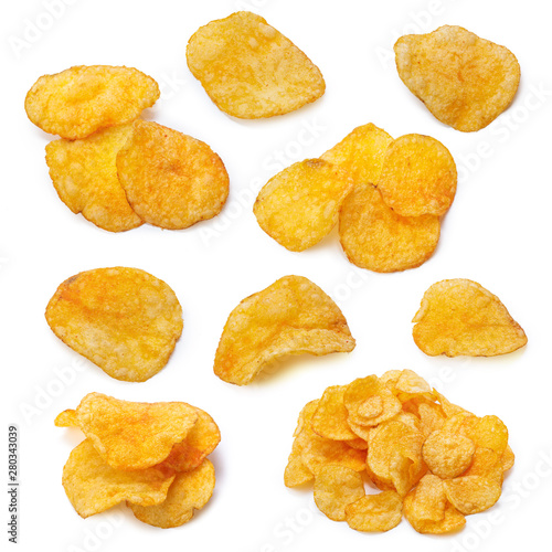 Set of potato chips close-up on an isolated white background