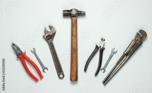 Set of professional work tools on a white background. Top view