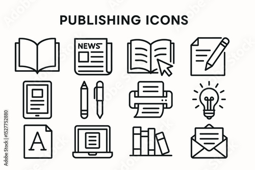 Set of publishing icons illustrating books, newspapers, writing tools, and digital media