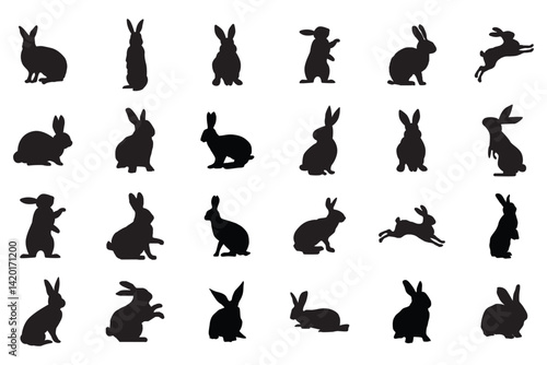 Set of rabbit silhouettes in various poses. Hand drawn black Easter bunny silhouettes isolated on a white background. Perfect decorative elements for design.