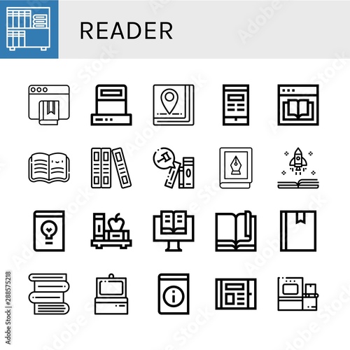 Set of reader icons such as Book, Ebook, Scanner, Open book, Books, Design book , reader