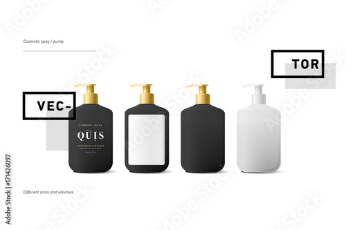 Set of realistic black bottle of liquid soap in white background. Cosmetic bottle for a cream, shampoo, oil, gel
