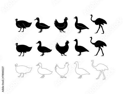 Set of realistic silhouettes of birds - black silhouette of chicken, turkey, duck ostrich rooster.