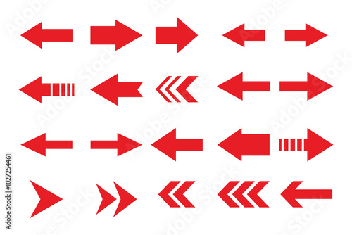 Set of red arrows. Arrow icons set in red. Arrow cursor icon. Vector set of various red arrows. Different cursor arrow direction symbols in flat style. Vector illustration