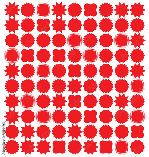 Set of red starburst. Price sticker, sale sticker, price tag, starburst, quality mark, retro stars, sale or discount sticker, sunburst badges, sun ray frames, promotional badge set, shopping labels 12