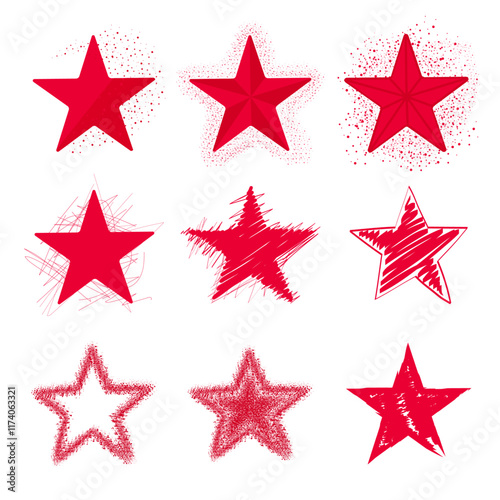 Set of red stars with various splashes and scribbles. Vector illustration isolated on white background.
