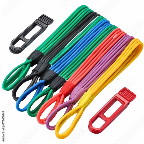 Set of resistance bands, various colors and tensions, detailed handles, isolated on white background