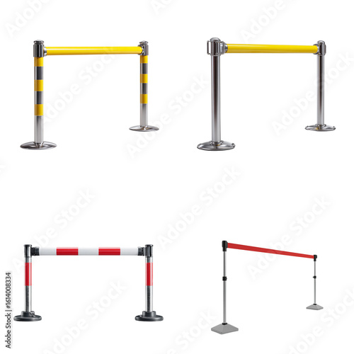 Set of retractable safety barrier poles, realistic 3D rendering, yellow, red, and metallic colors, used for crowd control or restricted access, on white background with copy space