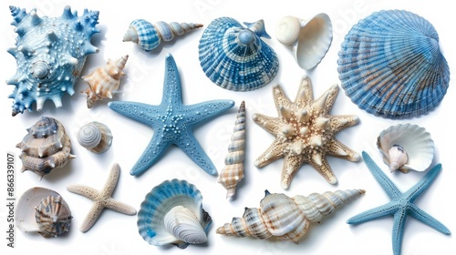 Set of retro starfish, seashells in blue danish pastel color palette, isolated