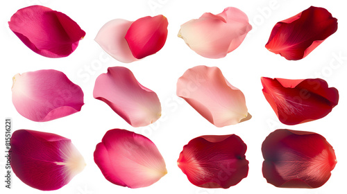 Set of rose petals in various shades from soft pink to deep red, showcasing texture and natural gradient
