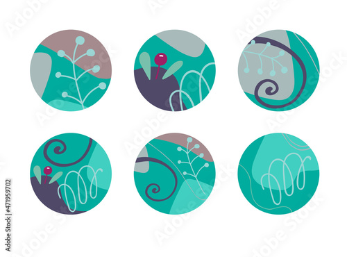 Set of round abstract backgrounds with colored spots, berries, branches, curls and lines. Vector illustration. Illustration for mobile apps, social media icons templates, designs, and advertisements.