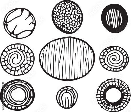 Set of round doodle hand drawn patterns and textures. Abstract organic shapes, different textured circles. Hand drawn vector illustration