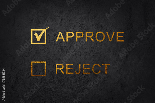 Set of round gold buttons with a check mark and a cross symbolizing a positive and negative assessment isolated on a black background. Approve and reject opinions.