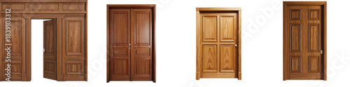 Set of rustic brown door variations with distinct panel divisions on transparent background