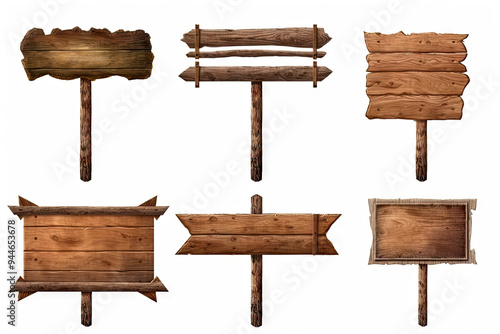 Set of rustic wooden signs with different shapes and borders, isolated on a white background for signage and design projects.
