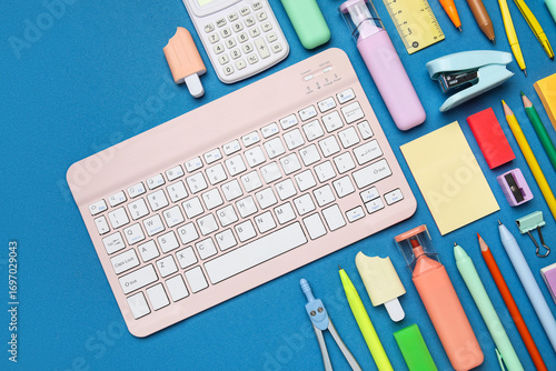 Set of school supplies with computer keyboard on blue background, closeup