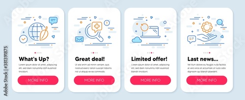 Set of Science icons, such as Recovery laptop, Environment day, Medical analyzes symbols. Mobile screen mockup banners. Employee hand line icons. Backup data, Safe world, Medicine. Work gear. Vector