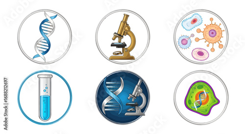 Set of scientific icons for biology and research, depicting DNA, microscopes, lab equipment, and various cellular structures