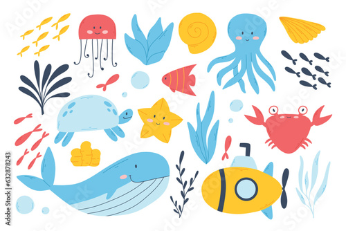 Set of sea animals in flat style. Vector illustration. Collection of marine inhabitants. Hand drawn crab, octopus, jellyfish, whale, fish.