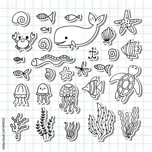 Set of sea animals in hand drawn style. Ocean life. Underwater, under the sea, marine. Stickers