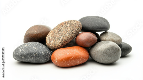 Set of sea stones isolated on a white background, including pebbles from the beach and natural minerals, presented in a high-quality photo.