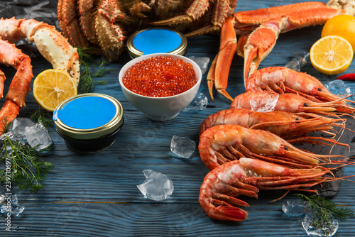 Set of seafood: red and black caviar, limb of hairy crab, limb of snow crab, far eastern kamchatka crab