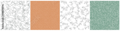 Set of seamless patterns with abstract geometric shapes, shapes, chaotic lines. Nature print with silhouettes of cats, leaves. Vector graphics.
