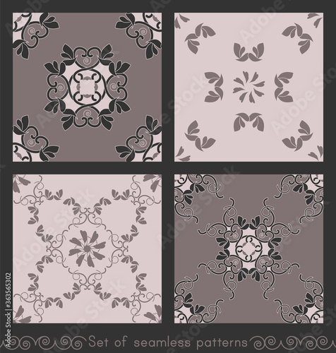 Set of seamless patterns with hearts, interlaced spirals and birds. Romantic. Colors Pinkish Brown dark and Pinkish Brown light, Dark grey. Vector.
