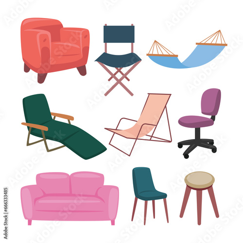 Set of Seat Chairs Isolated Element Objects with Dinning, Stool, Sofa, Armchair, Lounger, Folding and Desk. Flat Style Icon Vector Illustration