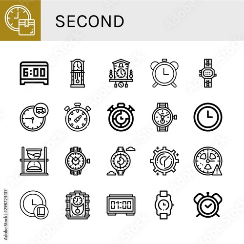 Set of second icons such as Clock, Alarm clock, Cuckoo clock, Alarm clocks, Watch, Time, Chronometer, Timer, Hourglass, Digital Wristwatch , second