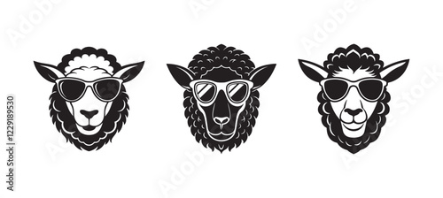 set of sheep head wearing sunglasses silhouette, black and white silhouette, vector and illustration