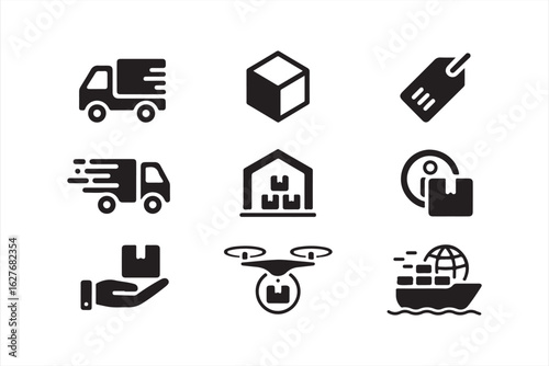 Set of shipping and logistics icons for freight, parcel, and global distribution