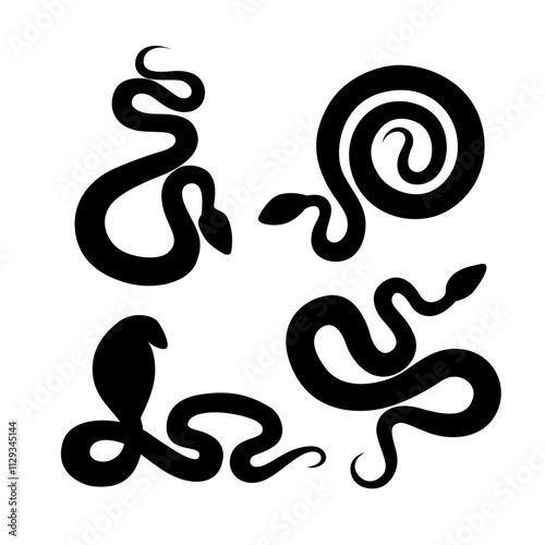 Set of silhouette of snakes. Isolated black flat cartoon silhouette of cobra and viper on white background.