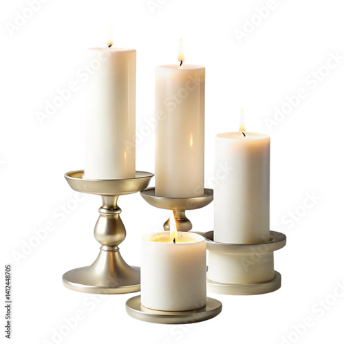 Set of silver candle holders with tall white candles, emphasizing luxury and classic elegance on a bright surface