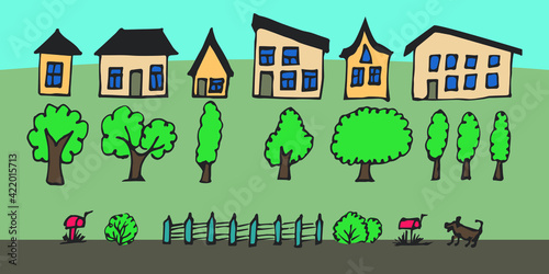 Set of simple houses and trees, street. Vector street, houses, bushes, trees.